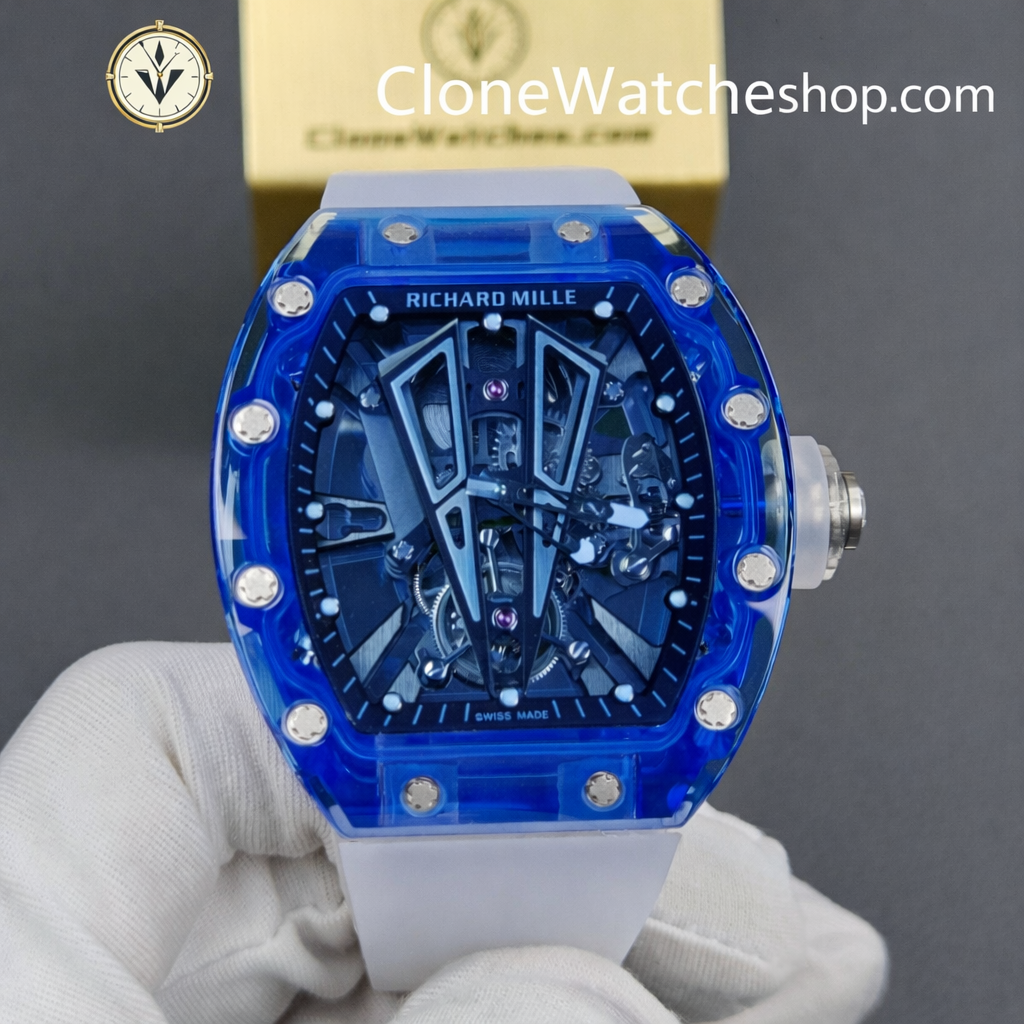 Richard Mille Super Clone Watches 1:1 RM 027 – 03 Blue Crystal Full Transparent Tourbillon White Strap