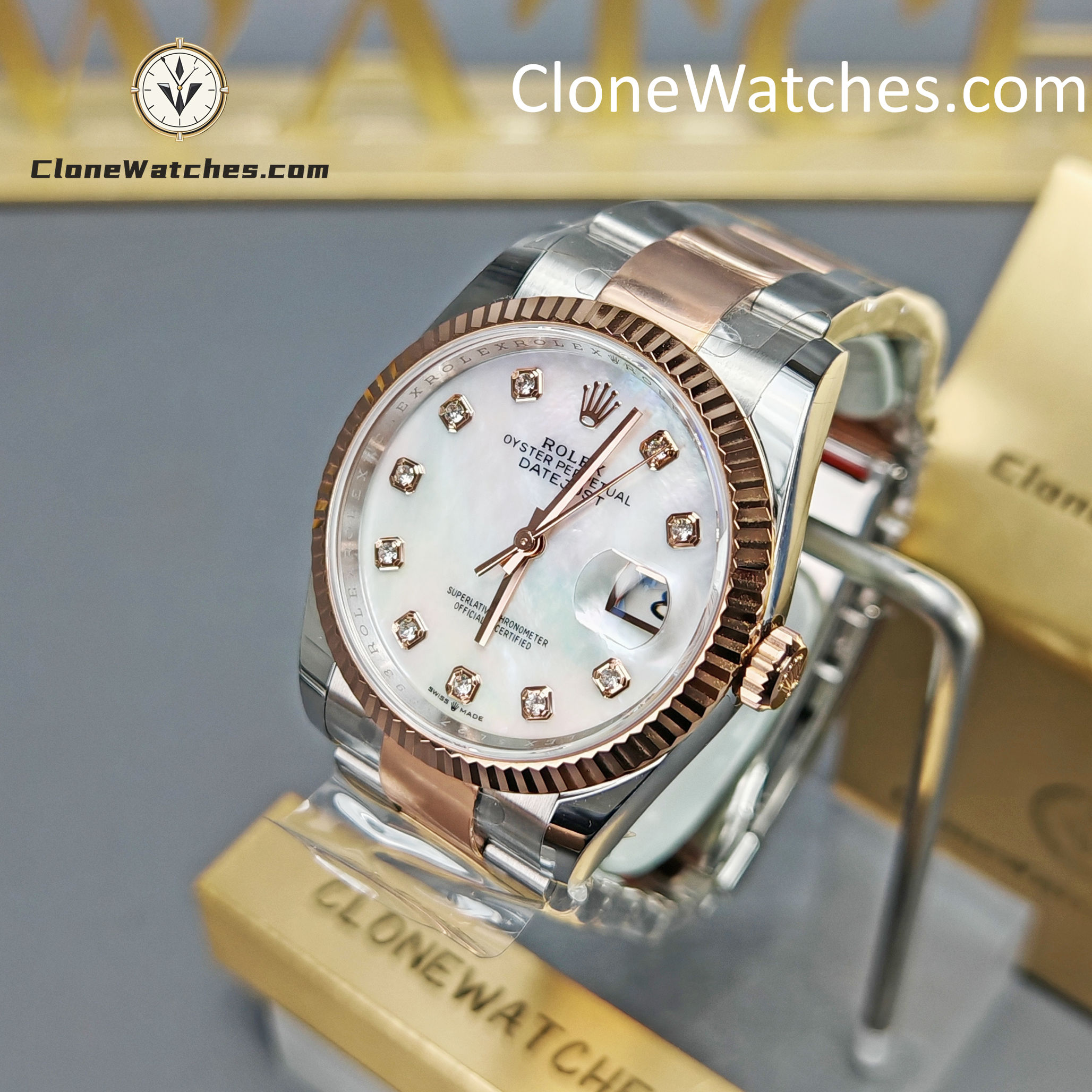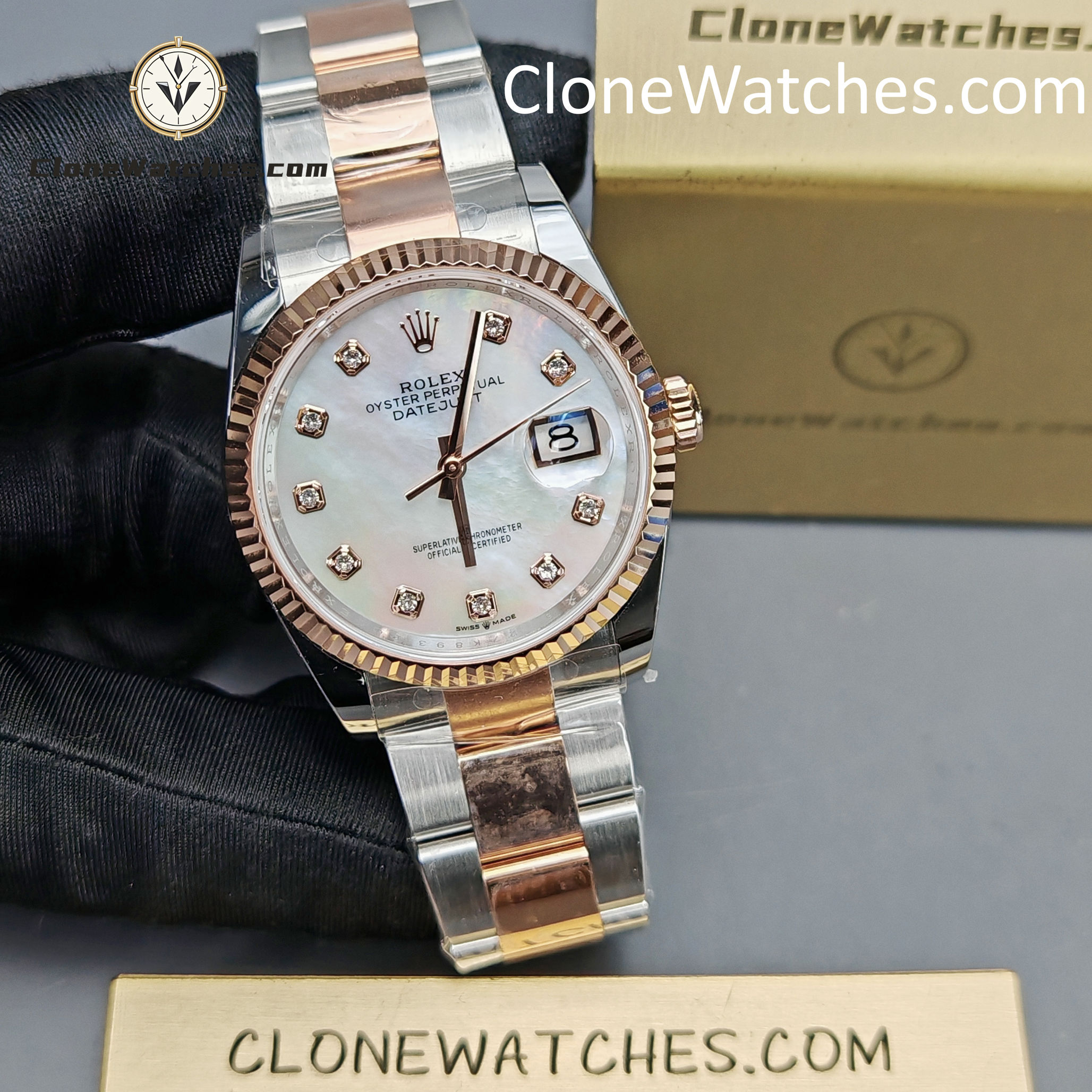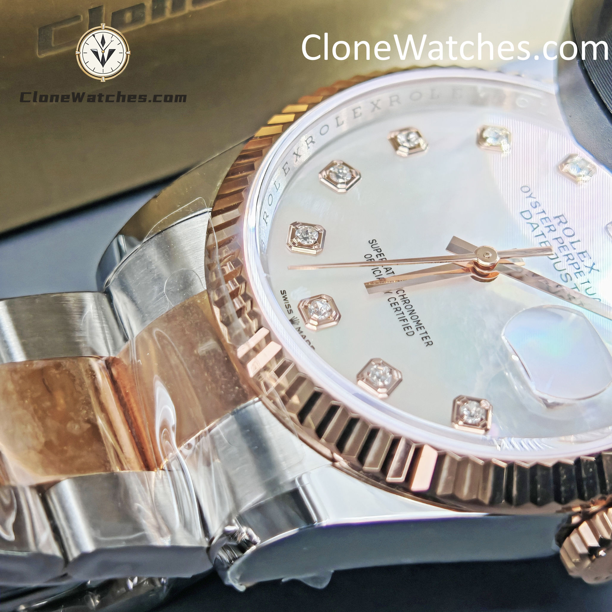 Powered by the latest Super Clone 3235 automatic movement, it delivers smooth performance and accurate timekeeping. The elegant mother-of-pearl dial is accented with sparkling diamond hour markers and the signature Cyclops date window, capturing the essence of timeless Rolex design.