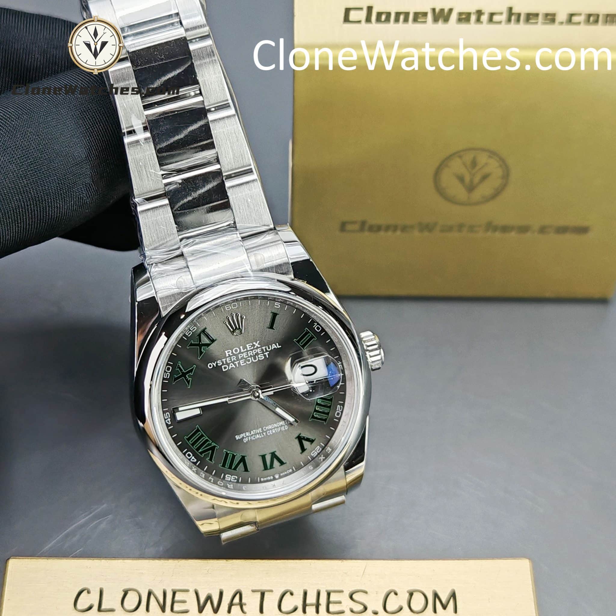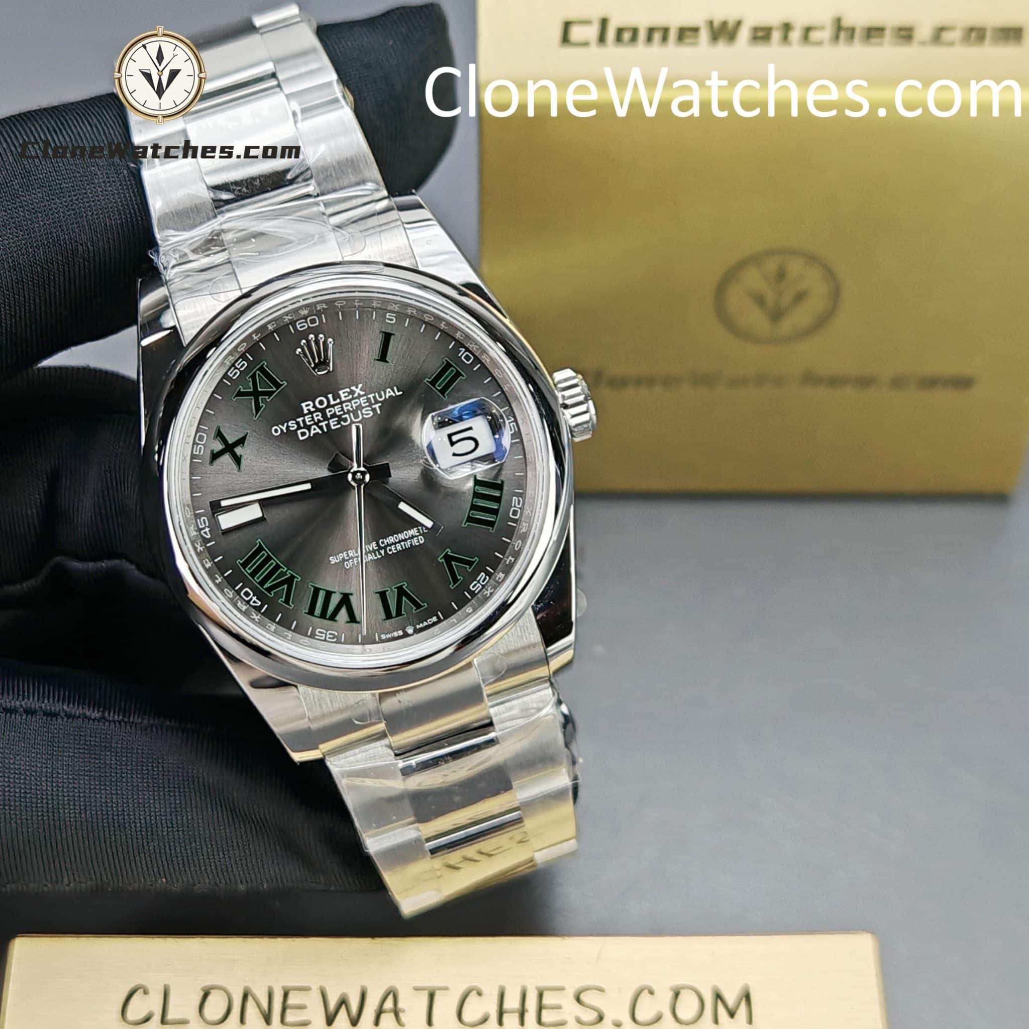 The watch features a refined sunburst grey dial with applied Roman numeral hour markers, delivering excellent depth and legibility under different lighting conditions. The iconic Cyclops lens provides accurate date magnification, perfectly aligned and proportioned—one of the key details that defines top-tier Super Clone Watches.
