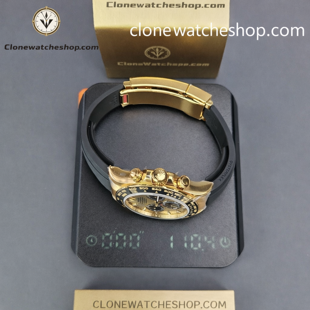 Oysterflex (Metal Core)Features the high-performance black elastomer strap with a flexible titanium-nickel alloy core. It mimics the genuine “longitudinal cushion” system for wrist stability, secured by a Gold Glidelock clasp.