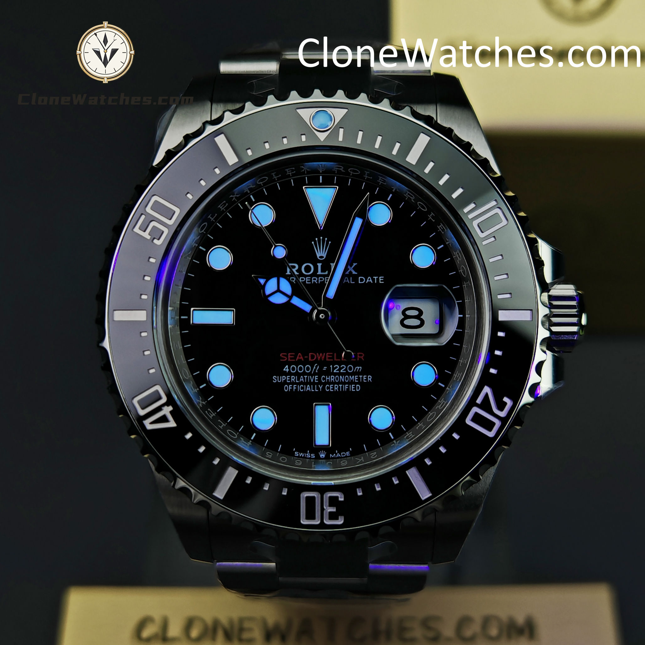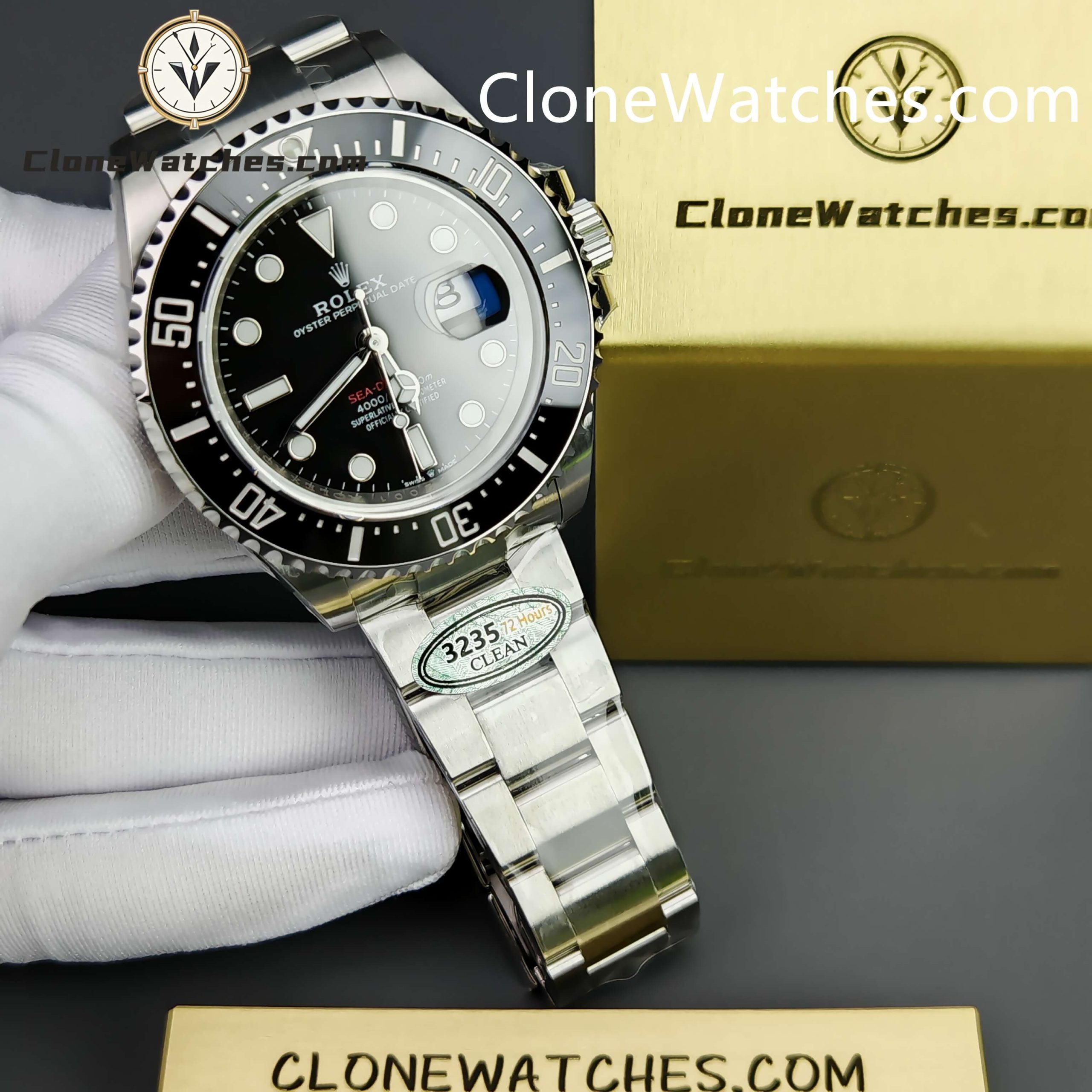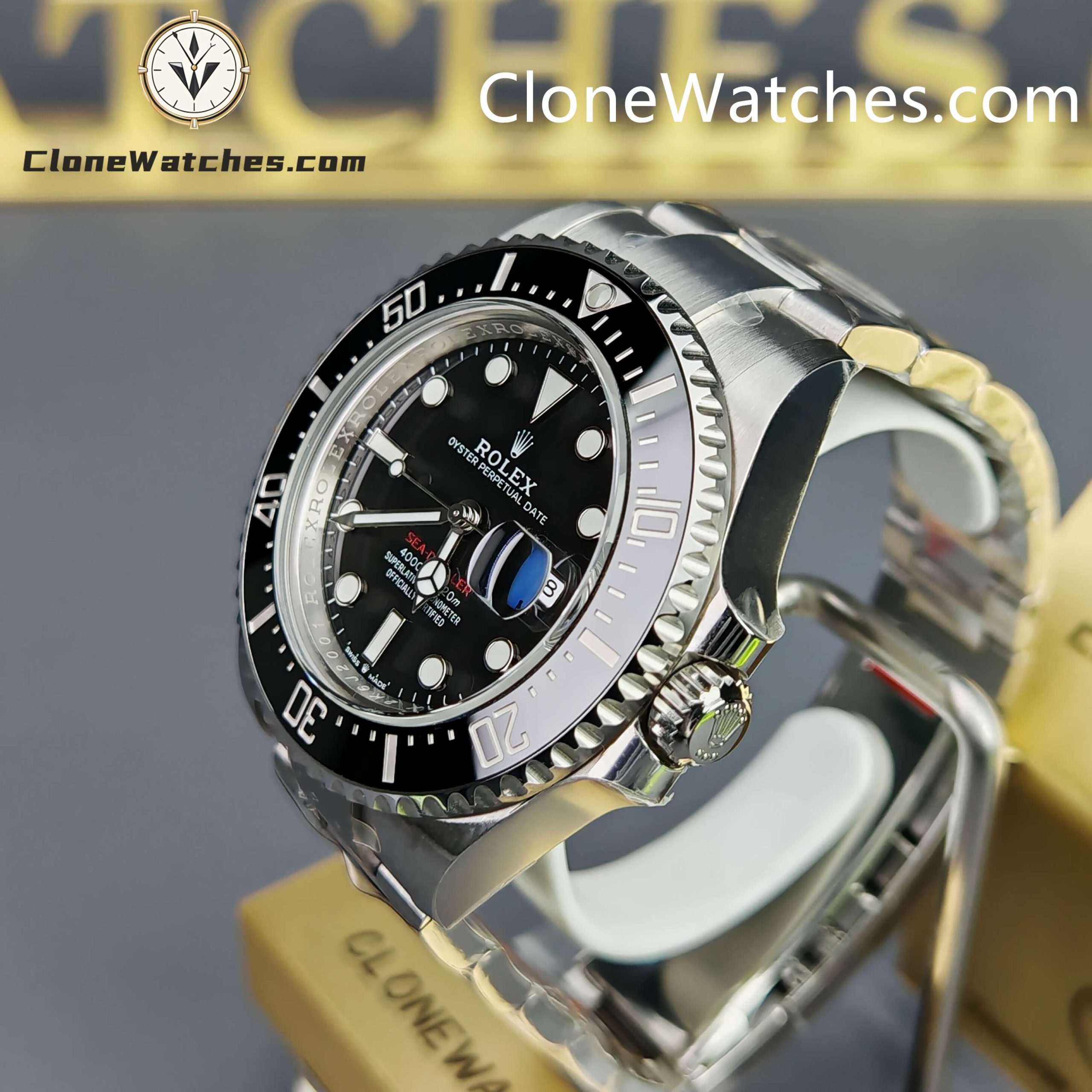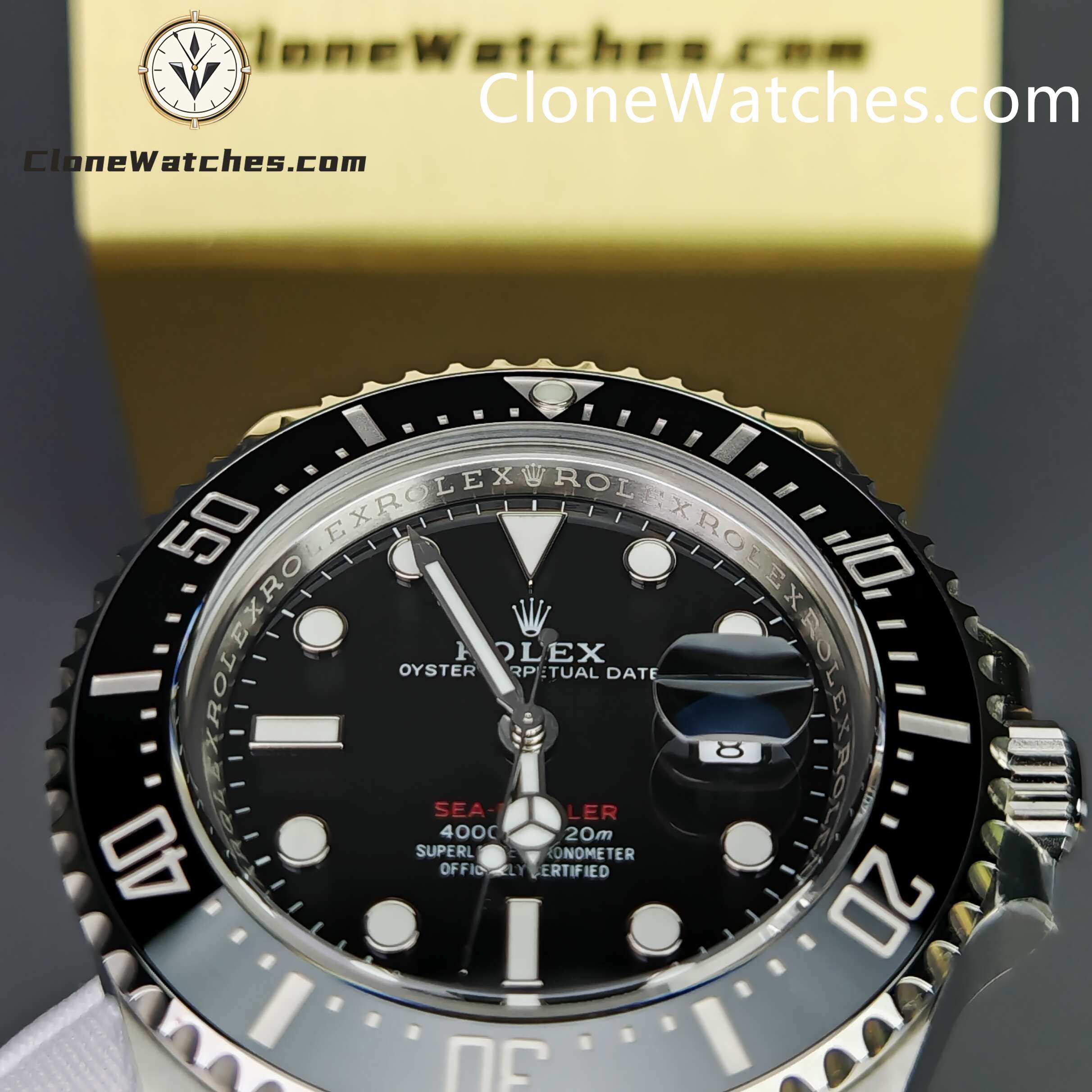 The gloss black dial features the iconic red “SEA-DWELLER” text, a nod to the original 1967 model. VSF captures the vibrant red hue and sharp font printing perfectly.